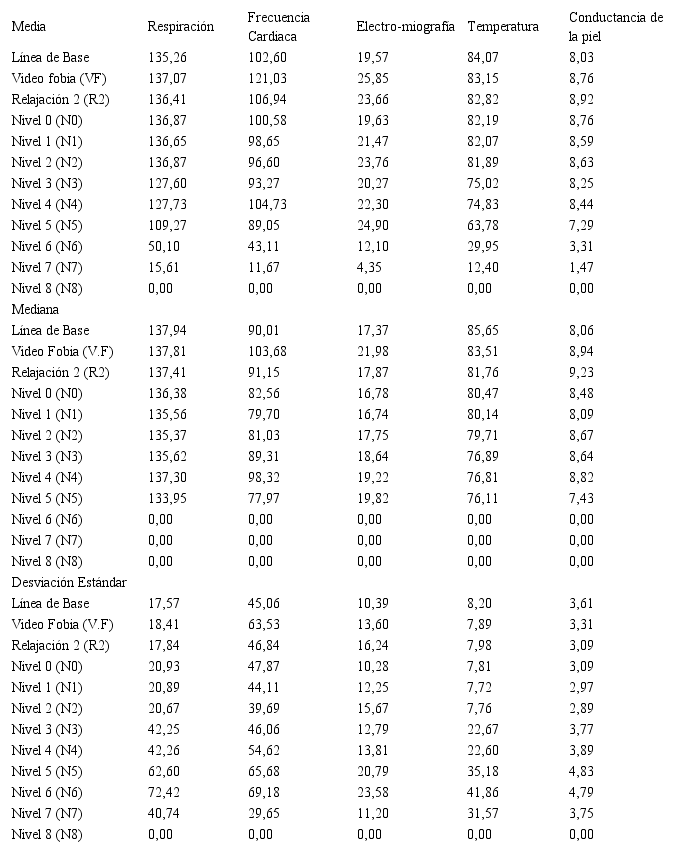 Es importante recordar que la plataforma de realidad virtual, utilizada en el presente estudio, está diseñada a partir de una jerarquía de tipo espacial (Zuluaga, 2015), en donde los participantes se deben aproximar al animal fóbico hasta el nivel determinado, según la sensación de malestar expresada por cada uno. Considerando el tamaño de la muestra (S=14), 2 llegaron al séptimo nivel, 3 hasta el sexto nivel, 6 hasta el quinto, 2 solo hasta el cuarto nivel, y uno solo llegó hasta el segundo nivel de la plataforma virtual. Dado que solamente algunas personas llegaron a los últimos niveles de la plataforma, se reducen los estadísticos para media, la mediana y la desviación estándar de las estadísticas de estos niveles.