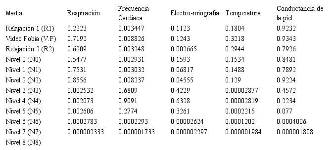 En la tabla 2 se puede evidenciar que, de manera general, la media y la mediana para las variables frecuencia respiratoria, conductancia de la piel, temperatura y electromiografía tienden a disminuir a medida que avanzan los niveles de la plataforma virtual, aunque este hecho se da, ya que los individuos de la muestra alcanzan los niveles superiores. De forma análoga, la desviación estándar (variabilidad) aumentó a medida que avanzaban los individuos en los diferentes niveles. Respecto a la frecuencia cardiaca se aprecia mucha dispersión de los datos.