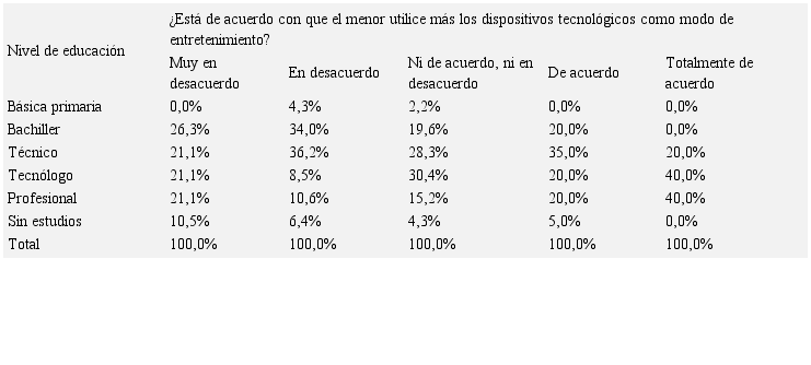 Si bien existía, en general, una percepción negativa por parte de los padres o responsables de los menores frente al uso de dispositivos tecnológicos, como nueva forma de entretenimiento, es preciso indicar que, respecto a los que sí tenían un percepción positiva, se logra detallar que el nivel de formación de los padres o responsables puede llegar a tener una influencia, en tanto se halló que, a medida que incrementa el nivel de formación de estos, hay una mayor aceptación; por su parte, los encuestados con un nivel académico de básica primaria, bachiller o sin estudios tienden a tener una mayor posición de desacuerdo frente a la siguiente afirmación (tabla 3):