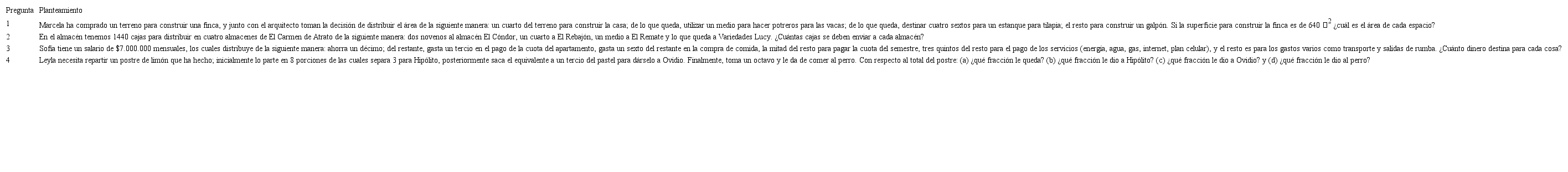 En la pregunta 1 se indaga sobre la ubicación de espacios en un lugar definido; si el resolutor opta por desarrollar algoritmos se enfrenta a varias operaciones con números racionales y naturales (suma, resta, multiplicación, división). Inicialmente debe traducir a términos matemáticos las fracciones que le son proporcionadas. Posteriormente, tomar un cuarto de 640 m. usando la fracción como operador, y del área total descontar lo usado para la casa. Nuevamente debe usar la fracción como operador y extraer un medio de 480 m.. Este proceso es repetido hasta completar los ítems de la pregunta. Es natural que los estudiantes opten por resolver el problema de manera gráfica, dado que les cuesta un poco más la comprensión de la fracción como operador. Por otro lado, debe hacer restas de lo que le va quedando, repartido en cada sección de la finca.