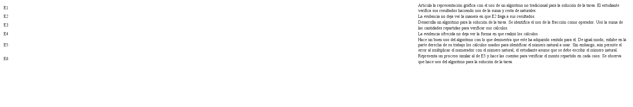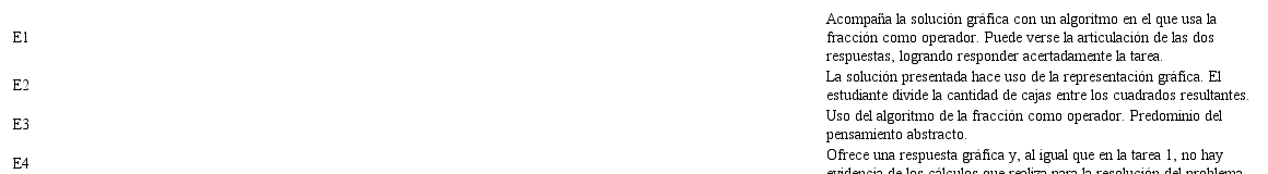 Para esta tarea, los estudiantes se valieron de ambas representaciones para su solución. Sin embargo, el caso de E1, E3, E5 y E6, se acerca a la configuración de un algoritmo formal para calcular las cantidades. En la tabla 3 se presenta los resultados de la tarea.