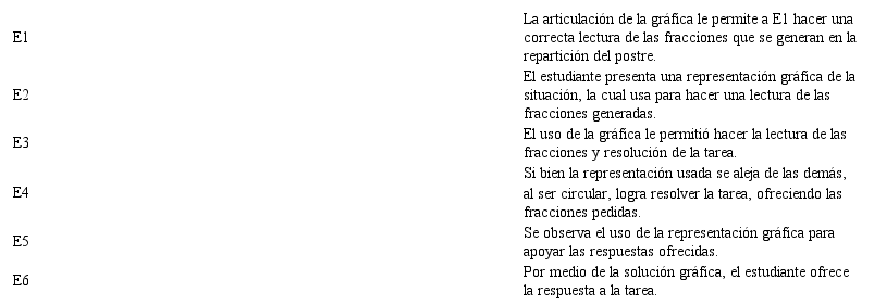 Los datos sugieren que los estudiantes se mueven entre las dos representaciones, de acuerdo con lo que consideran óptimo para resolver la tarea; es clave el apoyo que les ofrece la visualización del problema, dado que fortalece la comprensión de este y facilita su abordaje con más herramientas conceptuales. Sin embargo, también se evidencia que algunos estudiantes, como en el caso de E3, tienden a darle un mayor predominio al uso de algoritmos (tarea 1, 2 y 3) para resolver la tarea. Si bien el estudiante muestra rasgos de comprensión sobre los pasos que debe realizar para resolver la tarea, no actúa de forma eficiente al dejar de lado la parte gráfica que le ayuda a resolver el problema; sin embargo, en la tarea 4 resuelve la tarea, valiéndose solamente de la representación gráfica.