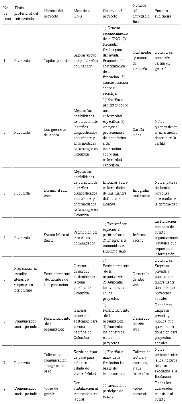 Se elaboraron, registraron en video y analizaron entrevistas estructuradas a ocho profesionales de la comunicación, que trabajaban o habían realizado actividades de comunicación para ONG. La búsqueda y selección de los profesionales se realizó a través de: 1) base de datos de egresados de la universidad en la que se inscribió el proyecto; 2) base de datos de una encuesta aplicada en el proyecto marco al que se asociaba este estudio[3]; y 3) directorios locales de ONG a través de Google (directorio de agremiaciones y asociaciones de la Corporación Autónoma Regional del Valle del Cauca, y directorio de ONG de la página web de la Alcaldía de Santiago de Cali, Colombia).