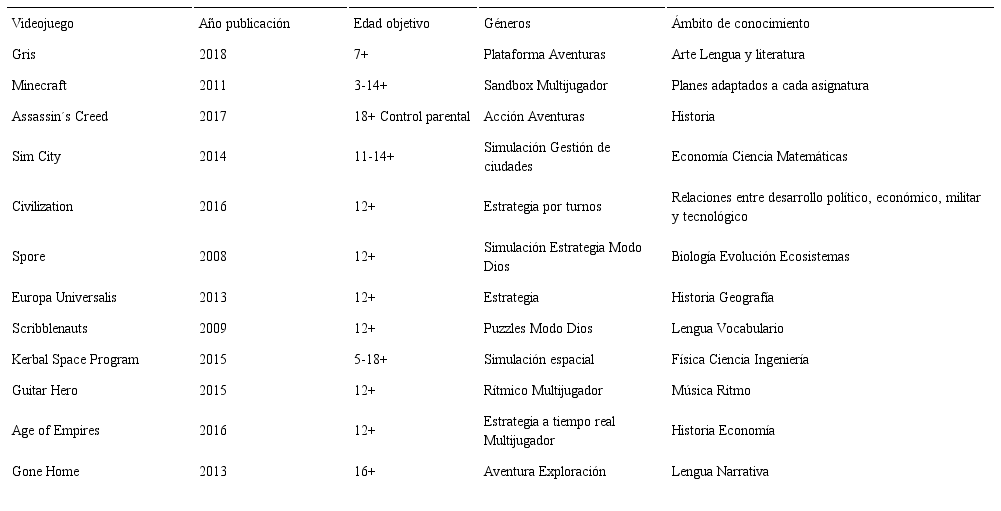 Con el objetivo de valorar la utilidad de los videojuegos en el entorno educativo, así como sus posibilidades para ser integrados en el currículum, en la tabla 1 se hace una revisión de los videojuegos comerciales que han tenido especial relevancia en educación durante los últimos años, entendiendo como videojuegos comerciales “aquellos que han sido diseñados para el ocio” (Lacasa et al., 2010, p. 11).