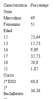 Los participantes de esta investigación fueron estudiantes de un Instituto de Educación Secundaria Obligatoria -ESO- de la Comunidad Autónoma de Cantabria. La muestra seleccionada de manera no probabilística e intencional por conveniencia se compone de 55 alumnos de la ESO y Bachillerato. Todos los participantes poseían conocimientos previos sobre videojuegos. La tabla 2 recoge las características de la muestra.