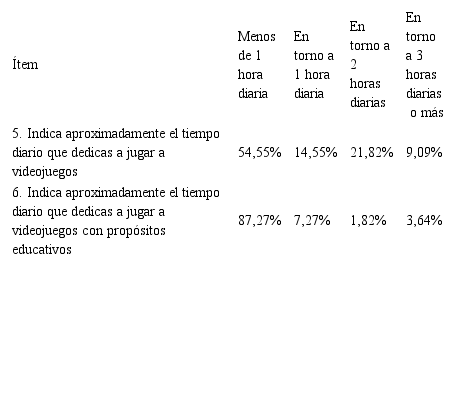 La tabla 3 muestra el tiempo diario que dedican los alumnos de Educación Secundaria a jugar a videojuegos, con propósitos lúdicos y educativos. El 54,55 % de la muestra dedica menos de una 1 diaria; no obstante, hay casi un 10 % que dedica en torno a 3 o más horas diarias. Respecto al tiempo que dedican los alumnos a los videojuegos educativos, el 87,27 % señalan que menos de 1 hora diaria.