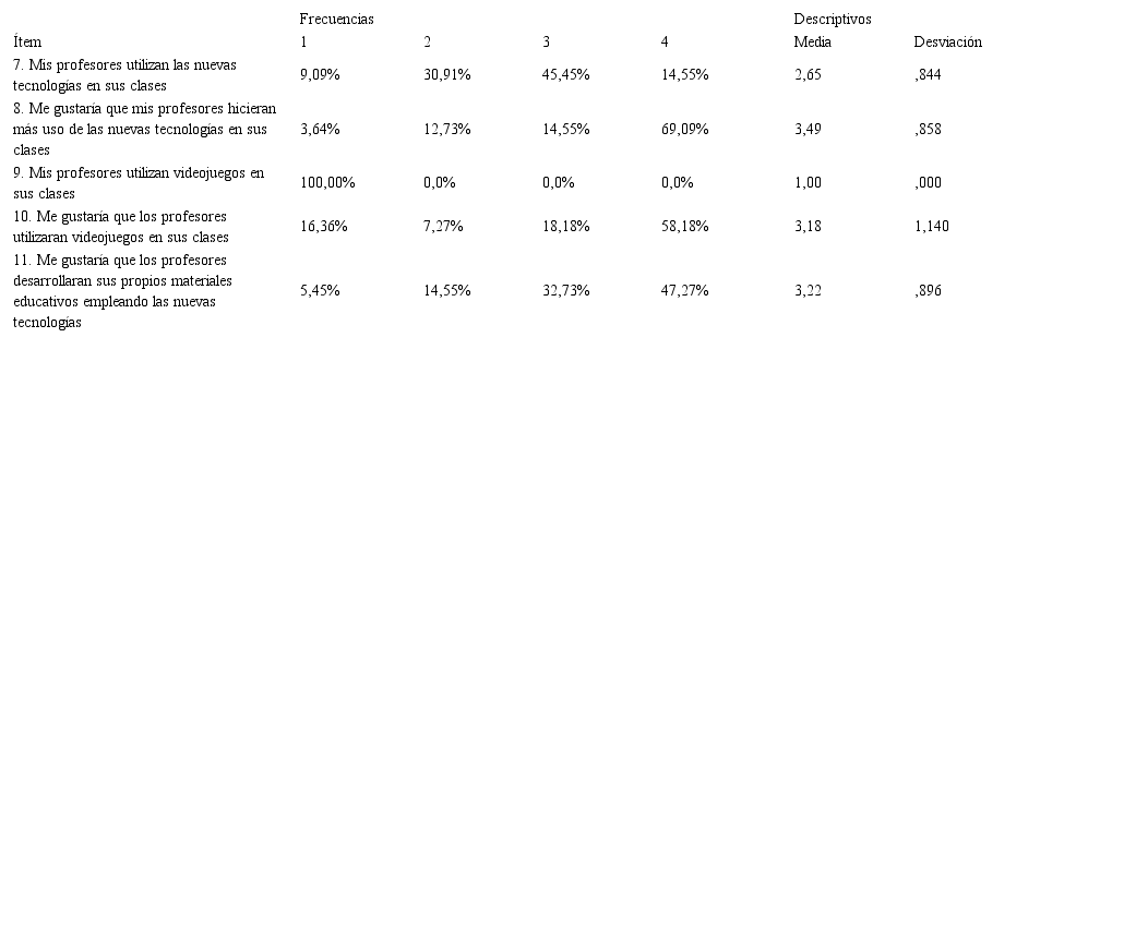 Por otro lado, aunque las TIC hayan sido incorporadas en el proceso educativo y los profesores hagan uso de estas en las clases, a los alumnos les gustaría que este uso se incrementara. Además, no hay indicios de que se utilicen videojuegos durante las clases, aunque los profesores los consideran un medio de carácter lúdico y dinámico que puede activar la motivación y efectividad del aprendizaje (AEVI, 2019). Los alumnos también confirmaron su interés en que los profesores utilicen videojuegos durante las clases y en el desarrollo de materiales educativos empleando las nuevas tecnologías.