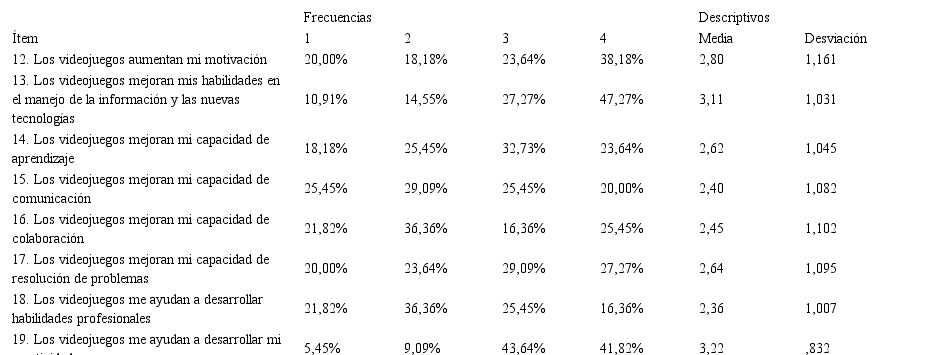 A pesar de ello, los alumnos tienen su propia opinión respecto a los beneficios de jugar a videojuegos. Los estudiantes coinciden en la mejora de su dominio de las nuevas tecnologías, el aumento de la motivación y en el desarrollo de la creatividad (Garmen et al., 2019), pero no hay una opinión clara sobre el incremento de sus capacidades de comunicación, colaboración, aprendizaje, resolución de problemas ni de sus habilidades profesionales (Vázquez-Cano y Ferrer Delgado, 2015).