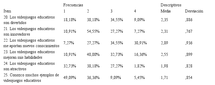 En la tabla 6 se muestran los resultados relacionados con el objetivo 4, que corresponde al bloque D del cuestionario. Con una media de 2.89 y los porcentajes más elevados en las opciones 3 y 4, los alumnos parecen estar de acuerdo en que los videojuegos educativos les aportan nuevos conocimientos. Respecto al ítem 2, “los videojuegos educativos son innovadores”, un 54.44 % respondió estar en desacuerdo. Destaca el desconocimiento de ejemplos de videojuegos educativos por parte de los alumnos, habiendo respondido tan solo un 5,45 % que están totalmente de acuerdo con la afirmación correspondiente, y siendo el ítem con la media más baja.