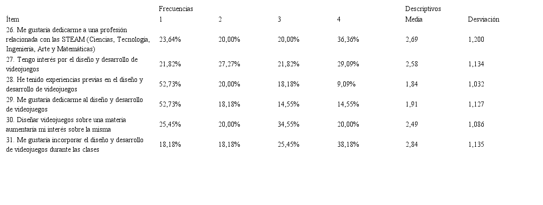 En la tabla 7 se pueden observar los resultados del bloque E del cuestionario. Con las medias más elevadas, y por encima del punto medio de la escala, los alumnos revelan interés por dedicarse a una profesión relacionada con las STEAM, y por incorporar el diseño y desarrollo de videojuegos durante las clases. No existe una tendencia clara respecto al interés por el diseño y desarrollo de videojuegos y la relación entre el interés por una materia y la creación de un videojuego sobre la misma. Sin embargo, con un porcentaje del 52.73 %, en ambos casos, los alumnos están totalmente en desacuerdo, respecto a haber tenido experiencias previas en el diseño y desarrollo de videojuegos y el interés de dedicarse a ello.