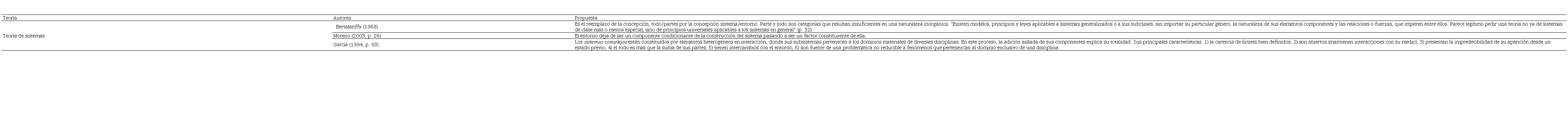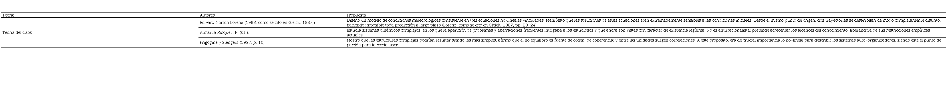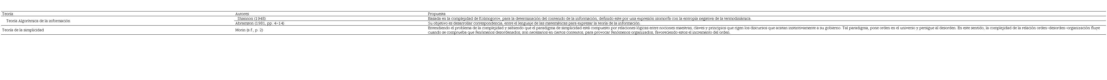 Cuando se analiza lo anterior, en la tabla 8 se muestra como Lorenz (1963, citado en Gleick, 1987), Prigogine y Stengers (1997) y Shannon (1948) realizan aportes interesantes desde la teoría del caos. Ahora bien, en la tabla 9, Morin (s.f.), Bertalanffy (1968), y García (1994) realizan consideraciones que validan la justificación de los fenómenos del universo y el paradigma que ello genera para los diferentes autores, al definir las teorías algorítmica de la información y la de la simplicidad, llevando esto, finalmente, a mostrar en la tabla 10, como Bertalanffy (1968), García (1994) y Moreno (2003), con la teoría general de sistemas y la interacción de los diferentes subsistemas que lo componen, contribuyen a analizar el paradigma de la complejidad.