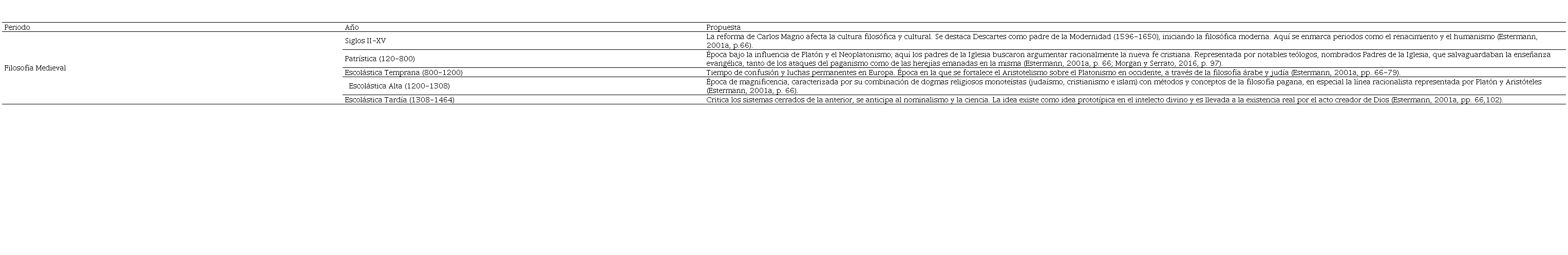 En la tabla 3, tabla 4 y tabla 5 se realiza un esbozo de cómo la historia del mundo transita a través de períodos de razonamientos, desde la filosofía medieval, pasado por la filosofía moderna, y culminando en la filosofía contemporánea; periodos en los cuales se rotula un crecimiento paulatino de la lógica y la voluntad, desde el mundo oriental hasta el mundo grecorromano y el cristiano-germánico (Bueno, 1974, p. 20). Lo anterior, lleva a ver la filosofía bajo tres contextos diferentes: 1) como un saber acerca de las cosas, 2) como una dirección para el mundo y la vida y 3) como una forma de vida. Todas corresponden a concepciones de la inteligencia, de las cuales se ha nutrido el mundo, confluyendo a nuevas formas de intelectualidad que, aunque defectuosas y limitadas, no las descalifica, pues provienen del hombre mismo y lo que ello implica.