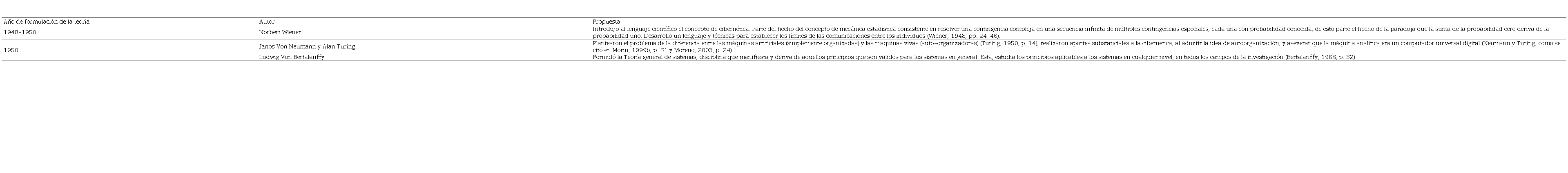 Como se muestra en la tabla 6 y la tabla 7, tales condiciones generan cuestionamientos que llevan a deducir a estos pioneros de la complejidad una línea eje que parte desde 1948, con la teoría cibernética y las maquinas artificiales, hasta la teoría general de sistemas, y que traspasa círculos culturales diferentes del helenismo y el racionalismo, exponiendo con una nueva visión, surgida del enriquecimiento de los filósofos que le anteceden, el concepto de materialismo histórico, hasta la adopción de sistemas de transformación y estructuración de algoritmos que ayuden a la comprensión y adaptación de metodologías, las cuales definan las dinámicas de las organizaciones contemporáneas que, alimentadas de la complejidad, van generando tanto problemáticas como soluciones a las necesidades productivas y sociales, hasta la década de los años 70.