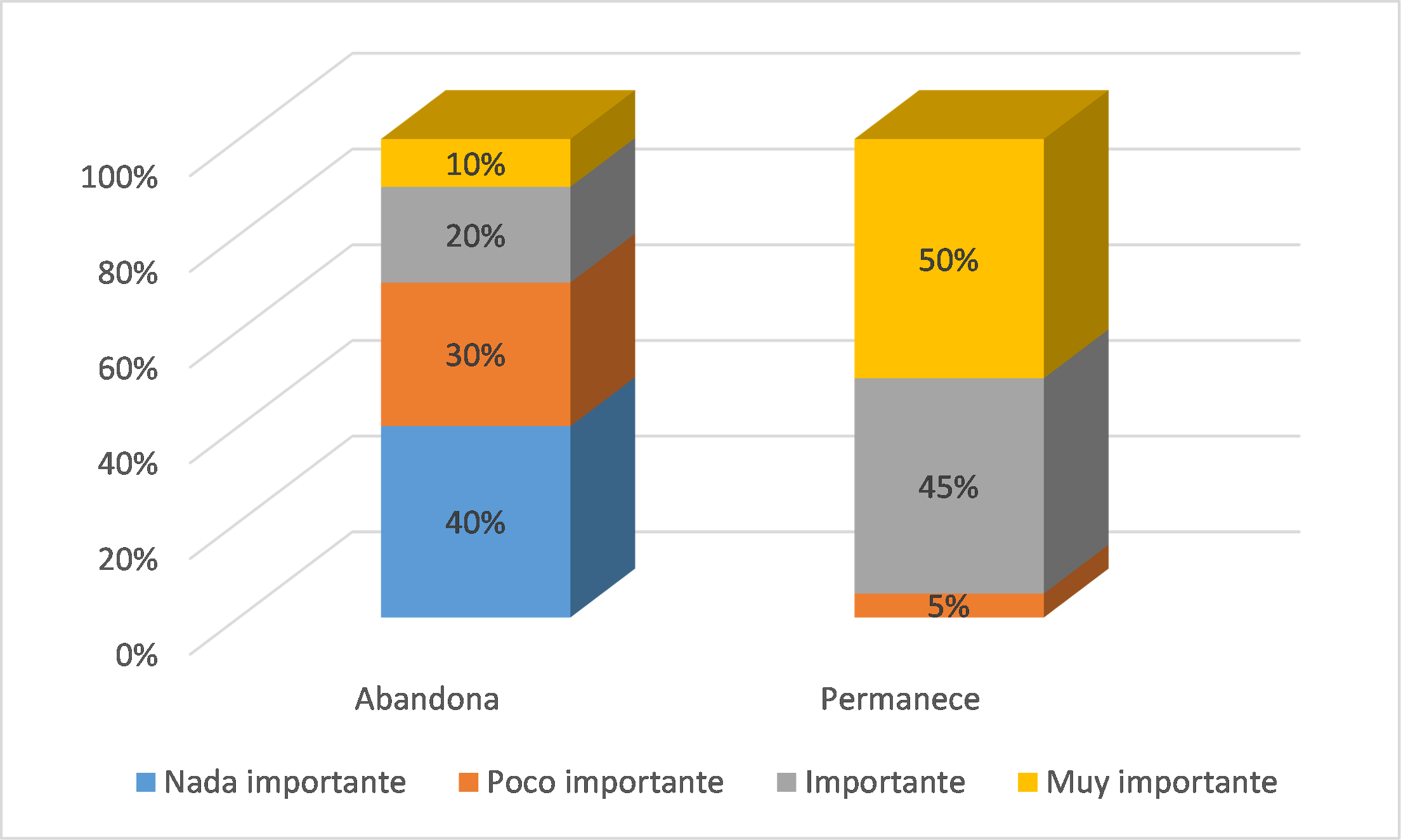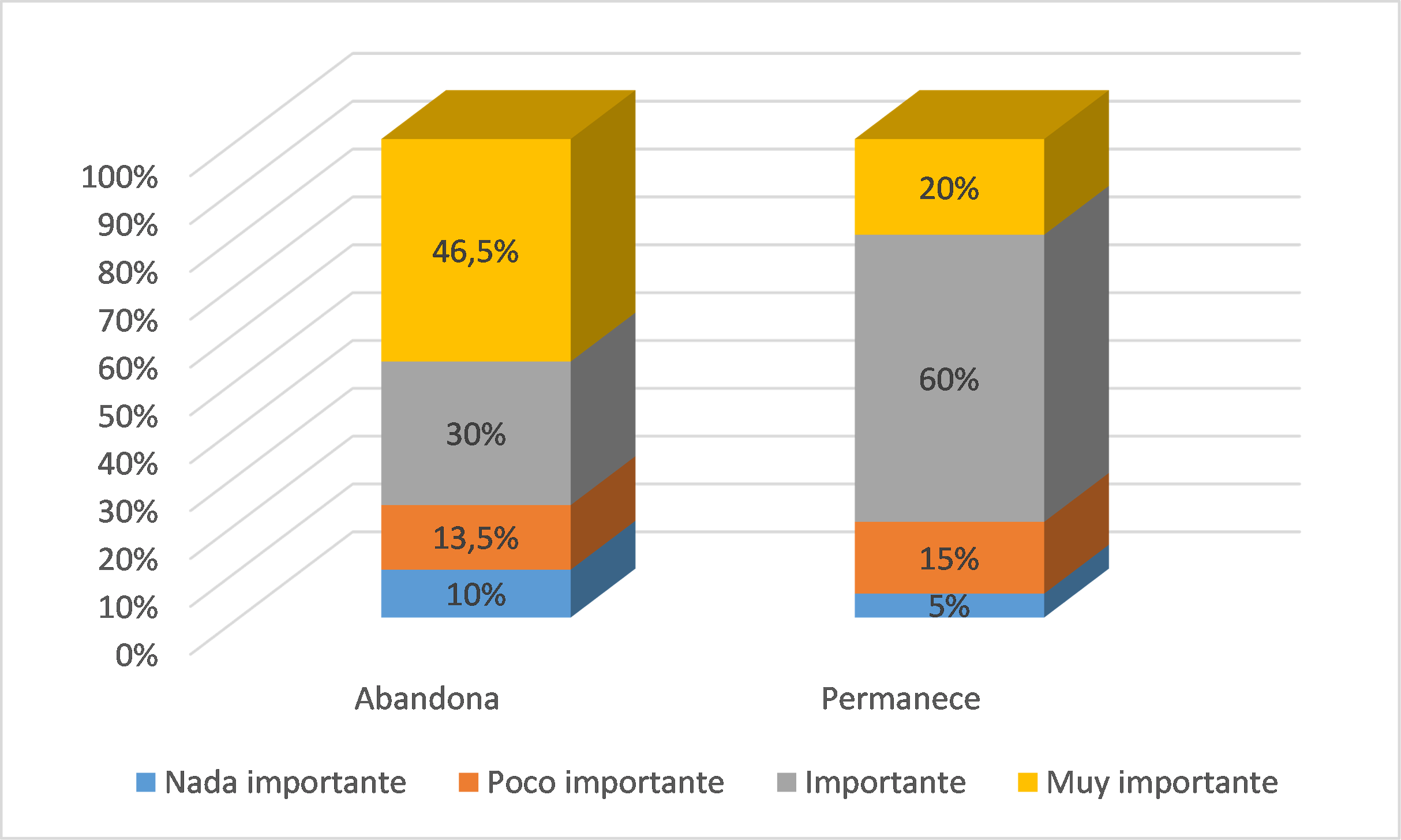 Por otro lado, en cuanto a la relevancia del proyecto de vida, la Figura 3 muestra que para quienes decidieron permanecer, la posibilidad de tener y lograr un proyecto de vida, contando con el aporte de la Universidad, fue importante o muy importante en un 95 %; a diferencia de lo que sucedió con quienes abandonan, donde existió un amplio espectro de opiniones acerca de no encontrar que esto fuera un aspecto crucial para su permanencia (40 %).