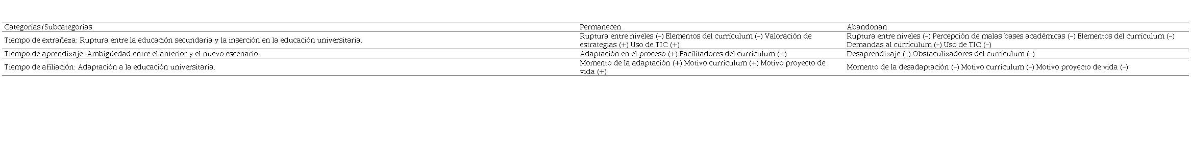 La categoría Tiempo de extrañeza se da al ingreso del proceso formativo y es cuando los estudiantes reconocen las debilidades que arrastran desde la educación secundaria. La categoría Tiempo de aprendizaje aparece durante el proceso universitario y plantea la resolución o perpetuidad de los inconvenientes detectados inicialmente. Y la categoría Tiempo de afiliación se da cuando el estudiante, como parte del cierre de su proceso formativo, decide permanecer o abandonar sus estudios.