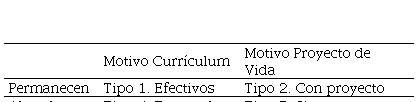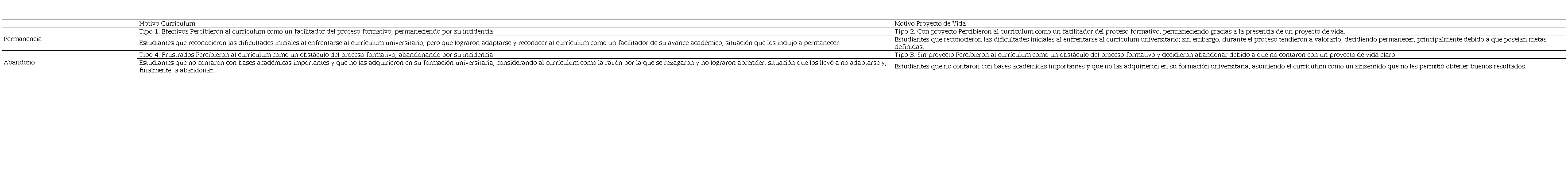 En la Tabla 3 se exponen las tipologías estudiantiles construidas, las cuales surgieron de la combinación de las subcategorías “Motivo currículum” y “Motivo proyecto de vida”, con las situaciones de permanencia o abandono.