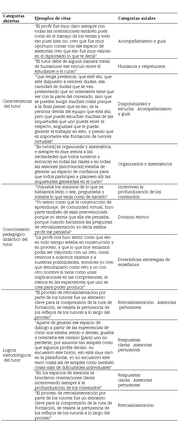 Abstract: This article describes a qualitative research, which was developed through four phases: theoretical exploration, construction of the training proposal, experimentation of the training proposal, and the data analysis process, and sought to contribute to the qualification of online education, and the recognition of conceptual, methodological and technical elements involved in university teaching processes. The main findings coincide in valuing the teaching presence, communication and interaction, teamwork, learning communities, autonomy and tutorial support, as essential elements in virtual tutoring. The perceptions of the participants in relation to what the tutor's teaching practices meant are also identified. Finally, the conclusions suggest the relevance of tutoring, as an attribute of virtual teaching, associated with the planning of the training process, from the recognition of forms of communication and interaction typical of cyberspace; thus enabling the consolidation of learning environments.