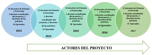 Se dio alcance al primer objetivo específico, el cual buscaba establecer el grado de participación en el programa Salud Escolar de estudiantes y docentes de las instituciones educativas, estudiantes, egresados y docentes de la UNISUCRE, durante el período 2013- 2017, ya que, al revisar la documentación que soporta el proyecto Salud Escolar, del programa, se observó que son dos las escuelas de la zona Sur Oriental del municipio de Sincelejo (Escuelas La Unión y San José) que se vincularon al programa, centrándose la mayor parte del trabajo en la Institución Educativa La Unión, con un 67 %. De los subproyectos implementados dentro del programa Salud Escolar (Juguemos con los sonidos, Leo-escribo y aprendo y Comuniquémonos mejor) se observa que la participación de los estudiantes de las instituciones educativas, para el 2013, en el programa Juguemos con los sonidos, fue de 348 estudiantes, el cual se incrementó para el 2017, con una partición de 438 estudiantes. En el programa: Leo-escribo y aprendo, para el 2013, se vincularon 181 estudiantes, con un mínimo incremento para el 2014, donde participaron 189 estudiantes; para los años posteriores, no se reportan actividades. El programa Comuniquémonos mejor vinculó para el 2013 a 900 estudiantes; sin reporte de actividades para los años posteriores. Se evidenció, entonces, que el programa que presenta permanencia en tiempo es Juguemos con los sonidos. En lo relacionado con número de egresados del programa de Fonoaudiología, por años, se pudo evidenciar que el 2014 fue el año en que más egresaron estudiantes del programa de Fonoaudiología (67 egresados), cifra que disminuyó para el 2017 en un 50 %. El programa siempre ha contado con un coordinador de prácticas comunitarias, y dos docentes que apoyan el proceso en la comunidad, como se puede observar en la Tabla 1 y Figura 1.