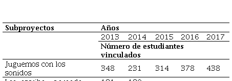 Dentro del programa de proyección social de la Facultad se encuentra el proyecto “Salud escolar”, cuyo escenario de acción son las escuelas de los barrios de la zona suroriental de la ciudad de Sincelejo, Colombia. El proyecto tiene como objetivo: “desarrollar acciones orientadas a la valoración del desarrollo físico, mental y social del escolar, con el fin de fomentar hábitos higiénicos y comportamientos saludables, desde su entorno escolar y familiar” (Villareal, 2012). Así las cosas, desde el accionar fonoaudiológico se viene trabajando, con el apoyo de docentes y estudiantes en formación, los tres subproyectos que de este se desprenden, como son: Juguemos con los sonidos, el cual va dirigido a estudiantes de transición y de los grados primero y segundo de Educación Básica Primaria; el subproyecto Leo, escribo y aprendo, el cual va dirigido a los estudiantes de los grados tercero, cuarto y quinto de Educación Básica Primaria; y el subproyecto Comuniquémonos mejor, que va dirigido a los estudiantes de Educación Básica Secundaria, para así contribuir con la mejora permanente de la calidad auditiva, comunicativa, del lenguaje y del aprendizaje de menores y adolescentes en condiciones de vulnerabilidad del municipio, siendo abordadas desde el ambiente escolar, a través de actividades de promoción, prevención (desde los niveles uno y dos de atención), consultoría, asesoría y evaluación, las cuales son asumidas con compromiso y respeto a lo estipulado en las políticas de desarrollo nacional, que buscan propender por el beneficio de los usuarios y de la comunidad en general.