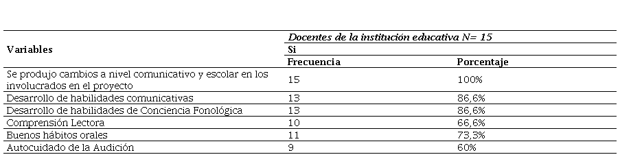 Por otro lado, se dio alcance al segundo objetivo específico: “Determinar el efecto a nivel de capacidades de desempeño adquiridas, a nivel cognitivo y comunicativo, de los niños y niñas involucrados al proyecto, de las instituciones educativas”. Después de analizar los resultados arrojados del análisis de las variables categóricas SI y No, y de las respuestas obtenidas de las encuestas diligenciadas por egresados y docentes coordinadores de las prácticas del programa de Fonoaudiología, y docentes y coordinadores de las instituciones Educativas, se pudo evidenciar que tanto egresados como docentes coordinadores de las prácticas comunitarias coinciden al responder que las habilidades en las que mejor resultados obtienen los estudiantes vinculados al proyecto es a nivel de comunicación oral, conciencia fonológica y procesos de lectoescritura, con porcentajes reportados entre 50 % y 100 %. Mientras que los docentes y administrativos de las instituciones educativas reportan otras habilidades, a nivel comunicativo, comprensión lectora, buenos hábitos orales y de autocuidado de la audición, con un porcentaje comprendido entre 60 % y 100 %, como se puede observar en las tablas 2 y 3.
