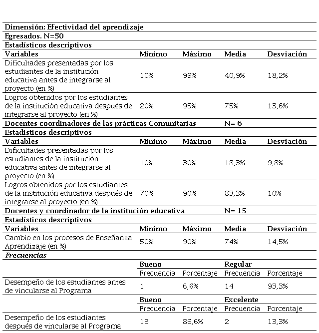 También, se dio alcance al tercer objetivo específico, el cual buscaba identificar el efecto en la actitud hacia procesos de aprendizaje, porcentajes de efectividad del aprendizaje y posibilidad de cambio en el desempeño de los involucrados en el proyecto. Primero, se realizó el análisis de variables numéricas en porcentajes (%) de la dimensión efectividad del aprendizaje, de las encuestas diligenciadas por egresados, coordinadores de las prácticas comunitarias y docentes y administrativos de la institución educativa, encontrando que, en esta dimensión, los encuestados reportaron que hay dificultades de desempeño y habilidades escolares de los niños y niñas antes de vincularse al proyecto, con puntuaciones porcentuales comprendidas entre (máx.= 99%; D= 18,2) a (máx.= 30%; D= 9,8%), mientras que después de vinculados al proyecto, estas puntuaciones porcentuales mejoraron, reportándose puntuaciones entre (máx.= 95%; D= 14,5%) a (máx.= 90%; D= 10%), como se puede observar en la Tabla 4.