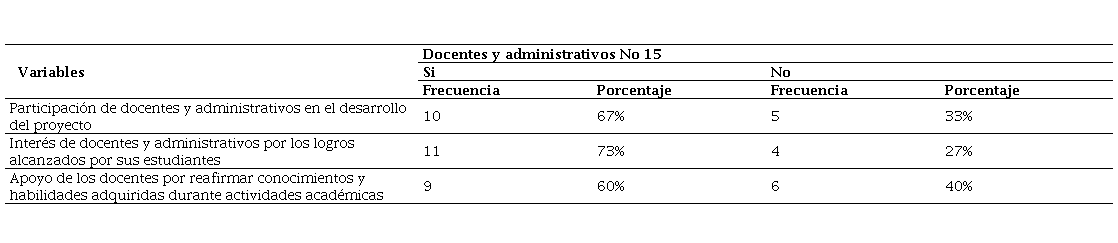 Por su parte, al analizar las variables categóricas SI . No, relacionadas con posibilidad de cambio en el desempeño de los involucrados en el proyecto (“actitud”), se observó que docentes y administrativos de las instituciones educativas reportan su participación, interés y apoyo en las actividades ejecutadas en el transcurso del proyecto, alcanzando puntuaciones porcentuales entre 60 % y 73 %, como se observa en la Tabla 5.