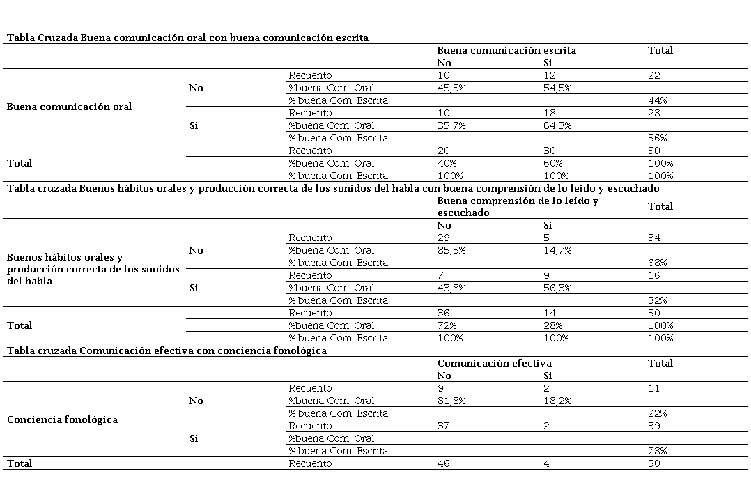 Al cruzar algunas variables de la dimensión “Capacidades de desempeño adquirido”, y según los datos reportados por los egresados en las encuestas diligenciadas, se pudo observar que, de los 50 egresados, el 56 % respondió que los estudiantes que participaron en el proyecto Sí alcanzaron una buena comunicación oral; de estos, el 64,3 % respondió que Sí alcanzó una buena comunicación escrita. Al cruzar la variable buenos hábitos orales y producción correcta de los sonidos del habla con buena comprensión de lo escuchado y lo leído, se observó que, de los 50 egresados, el 32 % respondió que Sí alcanzó buenos hábitos orales y producción correcta de los sonidos del habla; de estos, el 56,3 % respondió que Sí alcanzó una buena comprensión de lo leído y lo escuchado. Al cruzar las variables conciencia fonológica y comunicación efectiva, se observó que, de los 50 egresados, el 78 % respondió que Sí alcanzó una comunicación efectiva; de estos, el 5,1 % Sí alcanzó la conciencia fonológica (ver Tabla 6)