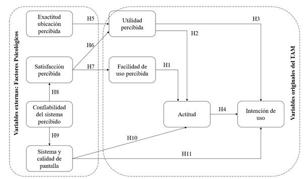 Las variables externas explican la variación en la utilidad percibida, la facilidad de uso y las actitudes de los usuarios. En ese sentido, como variables externas, Park, H. Kim & Ohm (2015) propusieron cuatro características esenciales para la adopción de sistemas de navegación para carros (precisión de ubicación percibida, satisfacción, confiabilidad percibida del sistema y calidad de servicio y visualización), de las cuales surgen las siguientes hipótesis, y, por consiguiente, el modelo de investigación (ver Figura 1):