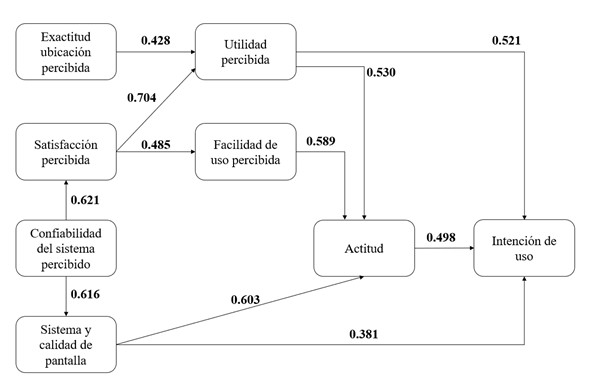 De acuerdo con el modelo, para que los jóvenes adopten sistemas de navegación para carros es necesario que, durante el uso, estos le perciban una óptima usabilidad, y en el proceso de usar un sistema predomine la facilidad de uso relacionada con la precisión en la ubicación geoespacial del vehículo. Luego de calcular el grado de asociación para las variables con una relación establecida, dentro del modelo, se obtuvo que: la relación más fuerte corresponde a los constructos satisfacción y utilidad percibida, las cuales arrojaron una correlación D de Somers equivalente a 0.704. De igual manera, en la Figura 2 se observa que hay una asociación alta entre la calidad de la pantalla y la actitud del usuario (0.603), y a su vez entre la calidad del sistema y pantalla con la confiabilidad percibida del sistema (0.616). Por otra parte, se evidencia que solo la relación entre la calidad del sistema con la intención de uso presenta una relación débil en el modelo que se propuso en la investigación.