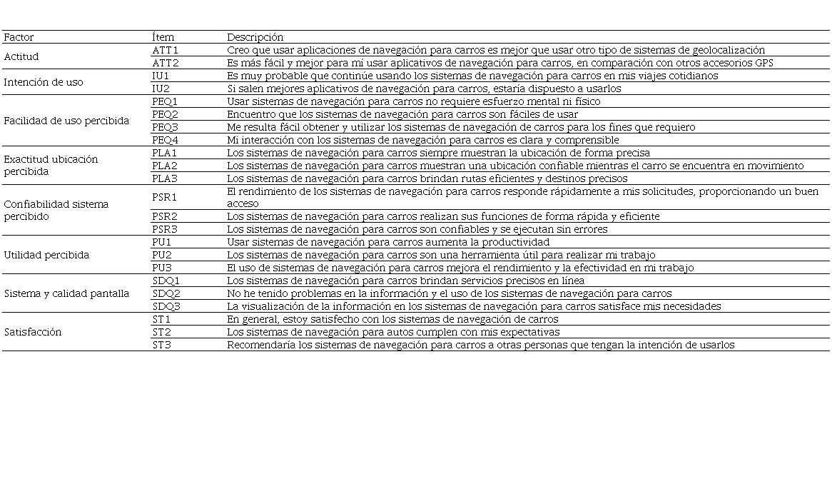 Resumen: Los sistemas de navegación para carros han sido uno de los accesorios más utilizados en todo el mundo, dado los beneficios percibidos en términos de información, en tiempo real, sobre el tráfico, la ubicación de los conductores en lugares desconocidos e información geográfica sobre direcciones o destinos deseados; por lo que, es imperativo conocer la percepción de sus usuarios para la mejora constante de este accesorio. En ese sentido, el objetivo de este estudio fue identificar los factores determinantes de la adopción de sistemas de navegación para carros, específicamente en la población joven, aplicándose un cuestionario en línea a 121 jóvenes. La metodología empleada siguió un análisis factorial exploratorio y confirmatorio con enfoque cuantitativo. Los resultados indicaron que los factores determinantes en la adopción de sistemas de navegación, por parte de la población joven, en orden de importancia fueron: la utilidad percibida, la actitud, la facilidad percibida y el sistema y calidad de pantalla, como factores cognitivos y psicológicos que se relacionan positivamente con la intención de uso de los jóvenes encuestados, lo cual hace aportes relevantes, tanto en el ámbito académico como en el industrial, para la toma de decisiones en cuanto a mejoras de esta tecnología.