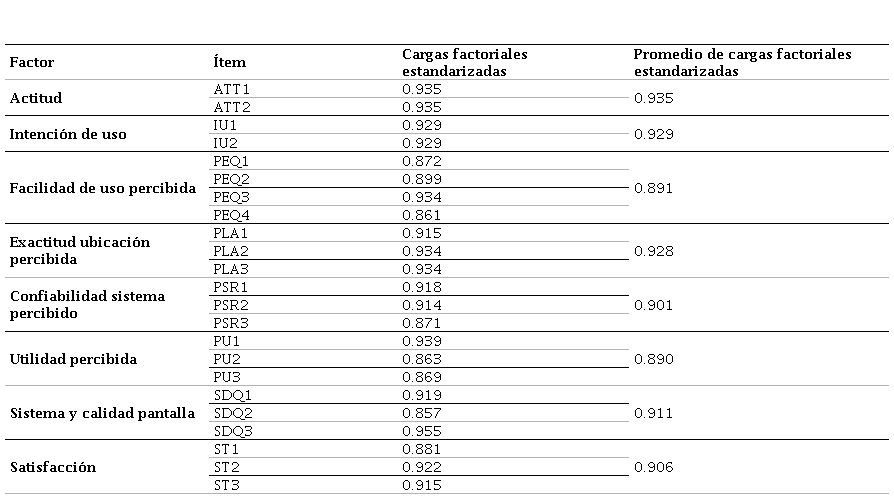 Se realizó un análisis de factorial, usando coeficientes estadísticos para evidenciar la validación de las escalas de medida, mediante un análisis factorial exploratorio (AFE) y un análisis factorial confirmatorio (AFC); en una primera instancia, se evaluó la magnitud de las cargas factoriales en cada uno de los constructos; en una segunda instancia, se realiza la validez convergente mediante los estadísticos KMO y prueba de esfericidad de Bartlett, para demostrar que los indicadores propuestos, en efecto, miden el determinado constructo. En una tercera instancia, se calcula la validez discriminante del modelo de medida como otra fuente de validez. De igual manera, se identifica la fiabilidad del modelo de medida a partir del estadístico Alfa de Cronbach, a fin de asegurar que los resultados del modelo son consistentes; finalmente, se realiza el contraste de hipótesis mediante la medición del nivel de asociación entre variables, para detectar los factores, relaciones y condiciones en las que se da el fenómeno de la adopción del sistema de geolocalización por parte de los jóvenes.