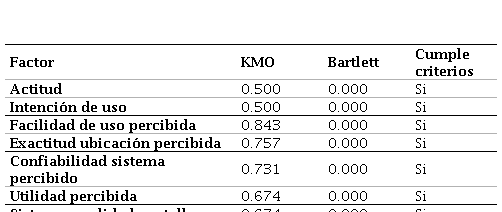 En el análisis de correlación entre las variables del modelo se midió con la medida de adecuación muestral Kaiser-Meyer-Olkin (KMO) y la prueba de esfericidad de Bartlett. El estadístico KMO, según las correlaciones parciales entre las variables y la prueba de esfericidad, contrasta la hipótesis nula de que la matriz de correlaciones es una matriz identidad (Kaiser, 1974; Lévy Mangin et al., 2006). Estos estadísticos permiten indicar que las variables están correlacionadas y que, por tanto, es factible continuar con el análisis factorial (Gutiérrez López, 2019). En la literatura se coincide en que los valores aceptables de la prueba de esfericidad de Bartlett deben ser inferiores a 0.05 y los valores del índice KMO no deben ser menores a 0.5 (Kaiser, 1974). A partir del cálculo de estos estadísticos se puede aclarar la realidad sobre los factores que intervienen en los procesos de aceptación y uso de sistemas de navegación para carros, como se puede ver en la Tabla 3. Se evidencia que todos los valores obtenidos de los factores, con respecto a estos estadísticos, cumplen, teniendo presente que los factores actitud e intención de uso son los de un menor puntaje; sin embargo, es apropiado continuar aplicando un análisis factorial.