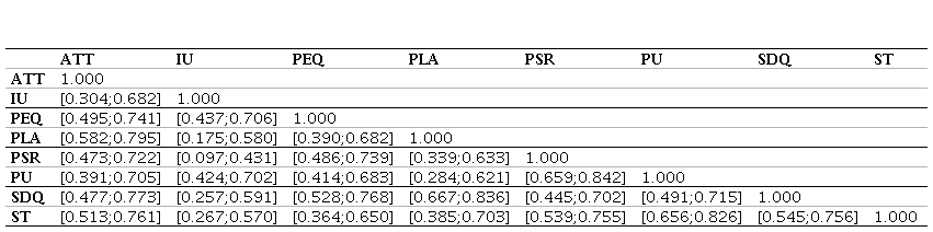 En la Tabla 6 se pueden apreciar los valores obtenidos para el estadístico utilizado. Los resultados obtenidos permiten visualizar que existen, en gran parte, asociaciones positivas entre las relaciones hipotéticas del modelo propuesto, indicando con esto una asociación adecuada entre la mayoría de los constructos; no obstante, se evidencia una relación poco representativa entre sistema y calidad, pantalla e intención de uso, dado que fue la única que obtuvo un valor de asociación de 0.381.