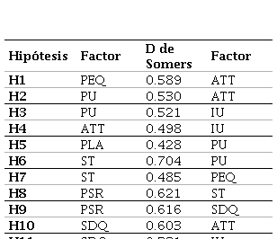 Posteriormente, se realizó la estimación del modelo estructural a fin de evaluar la relación entre las variables y en qué base determinan los jóvenes la adopción de sistemas de navegación para carros. Así pues, se medió el grado de asociación, en aras de contrastar las hipótesis planteadas por medio del estadístico D de Somers. Dicho estadístico se presenta en dos versiones, una simétrica y otra asimétrica, y puede adoptar valores de -1 y 1. Los valores representan una mayor asociación entre las variables a medida que estos se acercan a 1, una asociación negativa con valores cercanos a -1 y una asociación nula cuando es 0 (Grande Esteban y Abascal Fernández, 2005).