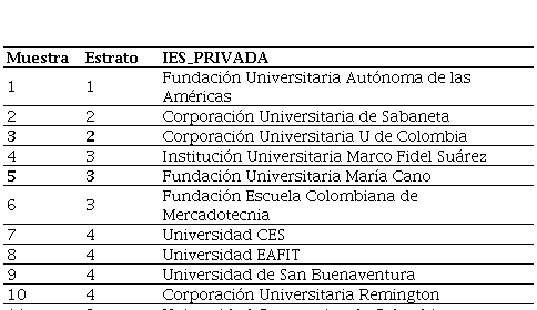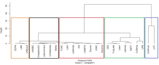 En la Figura 2 se muestra el dendograma de las 25 IES en 5 estratos; las universidades se agruparon con la instancia euclidiana (concepto estadístico), entre la variable número de estudiantes inscritos y número de programas vigentes. De acuerdo con el muestreo aleatorio estratificado, en cada estrato se tomó muestra. En la Tabla 2 se encuentran las universidades que se incluyeron en la muestra, utilizando el algoritmo de selección coordinado negativo en cada estrato.