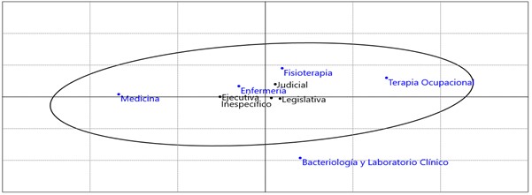 Finalmente, al analizar la totalidad de los comportamientos de las distribuciones en el plano cartesiano, se encontró que: los estudiantes de los programas de Medicina y Enfermería presentaron una tendencia al pensamiento en función ejecutivo, los estudiantes de los programas de Fisioterapia y Terapia Ocupacional hacia el aspecto judicial, y el programa de Bacteriología y Laboratorio Clínico al pensamiento de función legislativo.