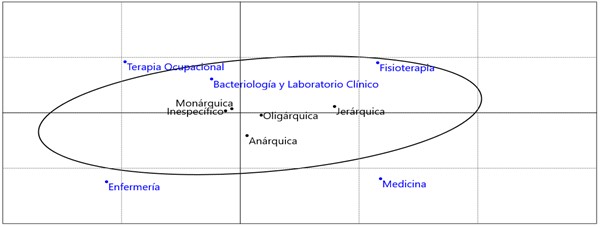 En cuanto a la forma, los programas de Terapia Ocupacional, Bacteriología y Laboratorio Clínico tuvieron una tendencia hacia lo monárquico e inespecífico; Enfermería no presentó tendencia marcada; Fisioterapia, hacia el pensamiento jerárquico; y Medicina a los aspectos anárquicos y oligárquicos.
