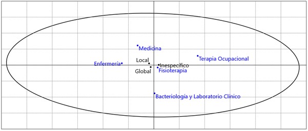 En la condición del pensamiento por nivel, se identificó que los programas de Medicina y Enfermería presentaron la tendencia a centrarse en los aspectos locales. Terapia Ocupacional, Fisioterapia y Laboratorio Clínico, por su lado, no presentaron una tendencia marcada, sino que, por el contrario, su tendencia fue inespecífica; es decir, que manejaron dualidad de pensamiento: locales y globales.