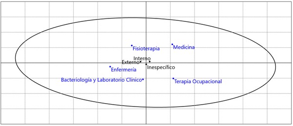 De otro lado, en el aspecto relacionado con el alcance, Enfermería presentó un alcance externo, mientras que Fisioterapia, Medicina, Terapia Ocupacional, Bacteriología y Laboratorio Clínico presentaron un alcance interno (ver Figura 4).