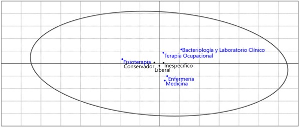 En relación con el alcance, los estudiantes del programa de Fisioterapia presentaron tendencia hacia lo externo, a diferencia del programa de Medicina que presentó tendencia a lo interno; por su lado, los programas de Terapia Ocupacional, Enfermería, Bacteriología y Laboratorio Clínico presentaron una tendencia inespecífica. Por último, se identificó que el programa de Fisioterapia presentó un tipo de pensamiento de inclinación conservadora, mientras que los programas de Enfermería y Medicina presentaron tendencia a un pensamiento liberal. También, se presentó dualidad en la inclinación del pensamiento liberal y conservador para los estudiantes de los programas de Terapia Ocupacional, Bacteriología y Laboratorio Clínico.
