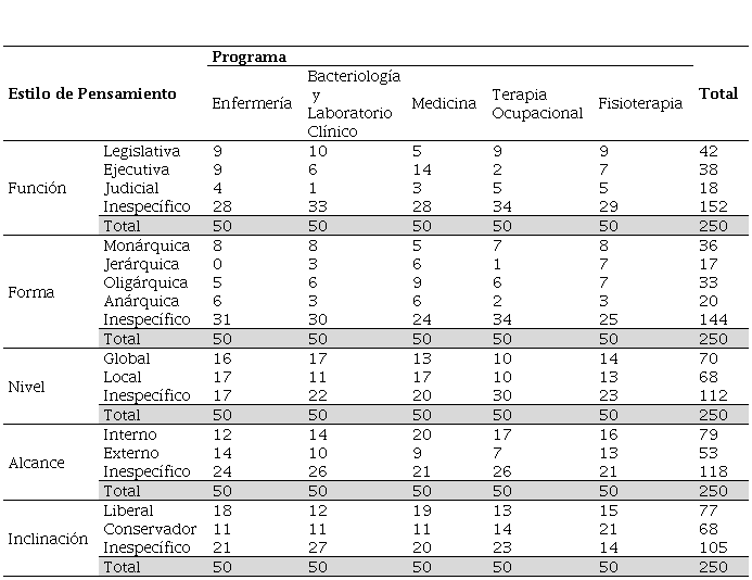 En la forma del pensamiento, los de Bacteriología y Laboratorio Clínico, Terapia Ocupacional y Fisioterapia tienen una mayor inclinación hacia la monarquía; los de Enfermería, hacia la monarquía y la anarquía; y los de Medicina, hacia la jerarquía, oligarquía y anarquía. En el nivel del pensamiento, los de Bacteriología y Laboratorio Clínico y Fisioterapia presentan una inclinación hacia lo global; los de Medicina y Enfermería, hacia lo local; y los de Terapia Ocupacional, hacia lo global y lo local. En el alcance del pensamiento, gran parte de los estudiantes tienden hacia lo interno, a diferencia de los estudiantes de Enfermería quienes prefieren lo externo. En la inclinación del pensamiento, los estudiantes presentan una mayor predisposición hacia lo liberal, aunque los de Fisioterapia tienden hacia lo conservador.