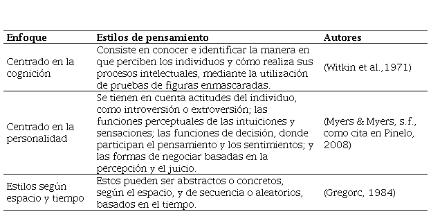 En este orden de ideas, saber cómo operan cognitivamente los estudiantes va a favorecer el proceso de aprendizaje y, con ello, la calidad académica. De allí que el presente estudio busca describir los estilos de pensamiento en estudiantes de la Facultad de Salud de una universidad privada en Norte de Santander, Colombia. Para tal fin, se revisaron los diferentes planteamientos que explican el proceso cognitivo del pensamiento, reconociendo caracterizaciones del proceso; varios autores conciben como estilos de pensamiento (EP) aquellas formas de explorar y usar los propios conocimientos, en función de la resolución de problemas u/o adaptación a las labores que demanda el estudio y profesión.