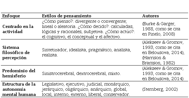 Los postulados teóricos se subdividen en: enfoque de sistema filosófico de percepción de Harrison y Bramson (1982) (estilos de pensamiento sintetizador, idealista, pragmático, analista, realista); enfoque de predominio del hemisferio de Alekseev y Gromov (como se cita en Zhang & Sternberg, 2002) (estilo de pensamiento sinistrocerebral, dextrocerebral, mixto); y el enfoque estructura de la autonomía mental humana de Sternberg, considerando los siguientes elementos: funciones, formas, niveles, esferas, tendencia (Zhang & Sternberg, 2002). Es representativo entre ellos Sternberg, por sus trabajos “sobre naturaleza y estructura de la inteligencia, formas de organización cognitiva y factores componentes de la misma especialmente la perspectiva para el estudio de habilidades diferenciales” (Castro & Casullo, 2002, como se cita en González et al., 2008, p. 34).