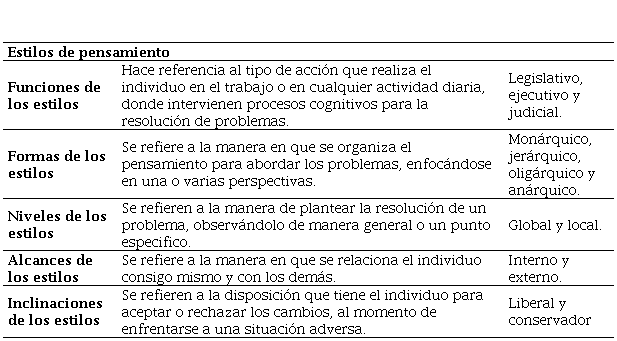 Los estilos de pensamiento son definidos por Sternberg (1999) como: formas de utilizar las aptitudes que tenemos. Por ello, se habla de perfil de estilos, a partir del cual se desempeñan las funciones demandadas en el contexto, según preferencia. De igual forma, Sternberg (1999) refiere que: “las personas pueden ser prácticamente idénticas, en cuanto a sus aptitudes, y aun así tener estilos muy distintos” (p. 38).