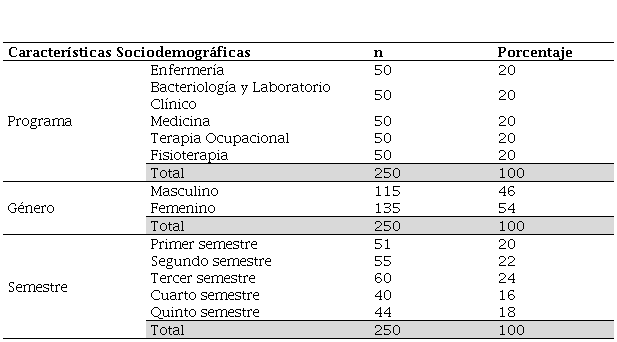 La muestra estuvo constituida por 115 estudiantes masculinos, lo cual corresponde al 46 %, y el 54 % (135 estudiantes) de género femenino; el 20 % (51 estudiantes) cursaba primer semestre; el 22 % (55), segundo; el 24 % (60), tercero; el 16 % (40), cuarto; y el 18 % (44), quinto semestre.