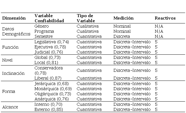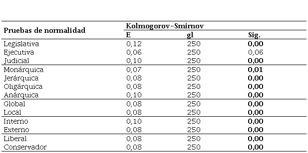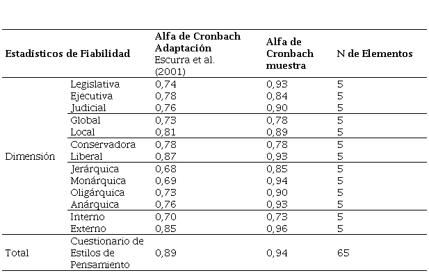 Para estimar la confiabilidad de la variable y sus dimensiones, se utilizaron las puntuaciones directas (variables cuantitativas discretas), a las cuales se les aplicó el coeficiente de Alfa de Cronbach (Ciro, 2016; Martínez-González et al., 2014; Rivera et al., 2018). Se analizó el valor según su cercanía a 1. En cuanto al Cuestionario de Estilos de Pensamiento, se identificó una alta fiabilidad en el instrumento (α 0.94), en sus variables (legislativa α 0,93; ejecutiva α 0,84; judicial α 0,90; global α 0,78; local α 0,89; conservadora α 0,78; liberal α 0,93; jerárquica α 0,85; monárquica α 0,94; oligárquica α 0,90; anárquica α 0,93; interno α 0,73; externo α 0,96), y en sus dimensiones (función α 0,77; nivel α 0,82; inclinación α 0,70; forma α 0,76; alcance α 0,68).