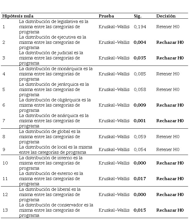 Según los valores que se obtuvieron de la prueba H de Kruskal-Wallis, se puede decir que la distribución de los datos en las cinco dimensiones de los estilos de pensamiento: legislativo, monárquico, jerárquico, global y local, es igual en los estudiantes, sin importar el programa académico (p ≤ 0.05); por tanto, se descarta la Hipótesis Nula de igualdad de los estilos de pensamiento ejecutivo, judicial, oligárquico, anárquico, interno, externo, liberal y conservador. Esto indicó que existen diferencias estadísticamente significativas según el programa académico (p < 0.05). La Tabla 9 presenta las contingencias en los cruces estilos de pensamiento y programa académico.