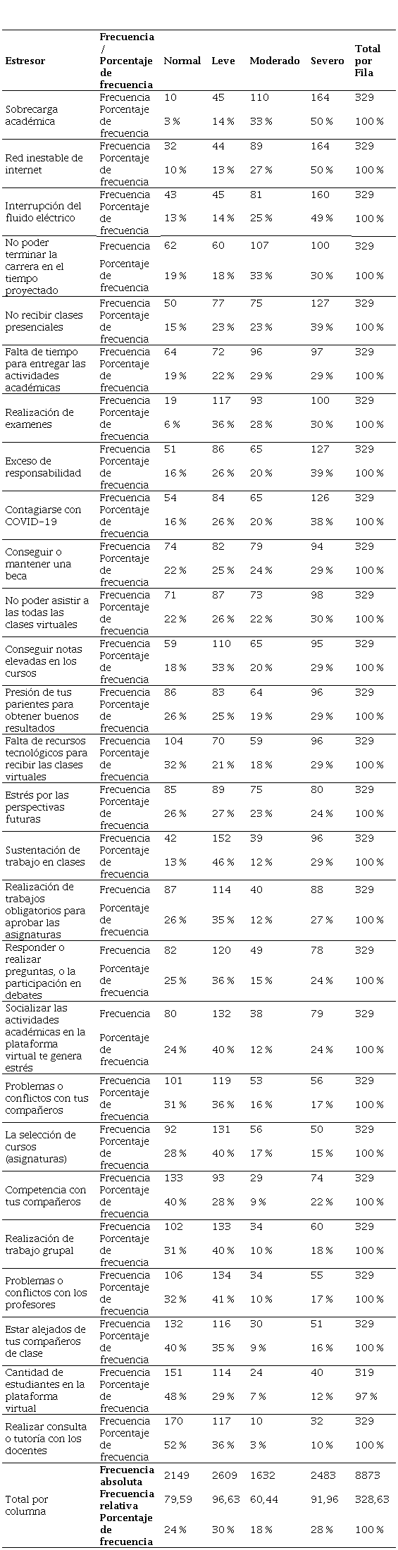 Además de los estresores relacionados con las actividades académicas, las matrículas y los servicios de fluido eléctrico e internet, el contagiarse con la COVID-19 estuvo dentro de los diez (10) estresores para los estudiantes objeto de estudio (Anexo 1). Según Rondón et al. (2020), la prolongación de la cuarentena y la pérdida de seres queridos aumentó el miedo al contagio, lo que causó estrés, agobio y desórdenes psicológicos; así mismo, el miedo a la infección por el virus pudo ocasionar frustración, producida porque en el periodo de cuarentena las personas no disponían de información y pautas de actuación claras ante este virus (Brooks et al., 2020).