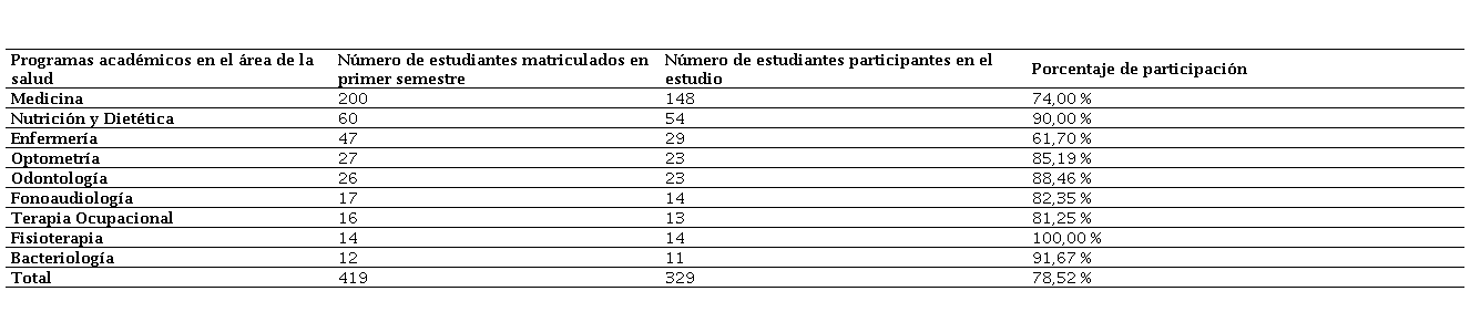 Cabe resaltar que esta investigación abarcó nueve programas del área de la salud, siendo una muestra representativa, debido a la alta participación del estudiantado (329), lo cual corresponde al 78,52 % de los estudiantes matriculados en primer semestre (Tabla 1).