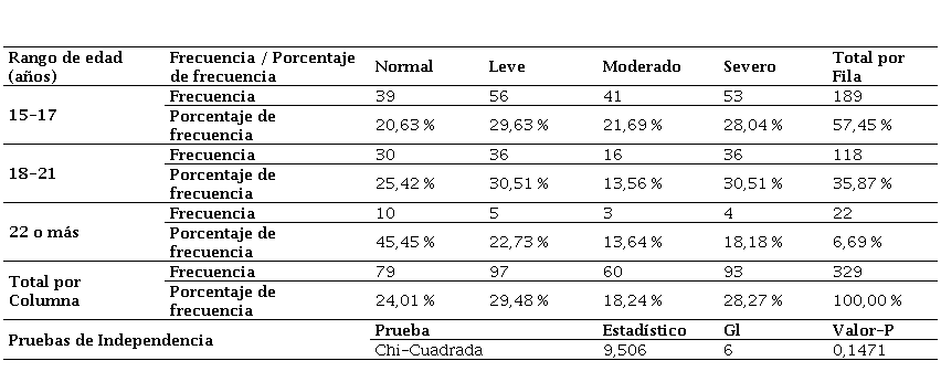 De acuerdo con los niveles de estrés, por rango de edad, se obtuvo que la percepción de estrés normal fue mayor en el rango de edad comprendida entre los 22 años o más. Con respecto a los otros rangos de edad, no mostraron un marcado resultado, debido a que entre estos las diferencias en porcentaje, entre los diferentes niveles de percepción, fue mínima (Tabla 2). De igual forma, se registró que el valor-p fue de 0,1471; por tanto, los niveles de estrés percibido son independientes de la edad en los estudiantes encuestados.